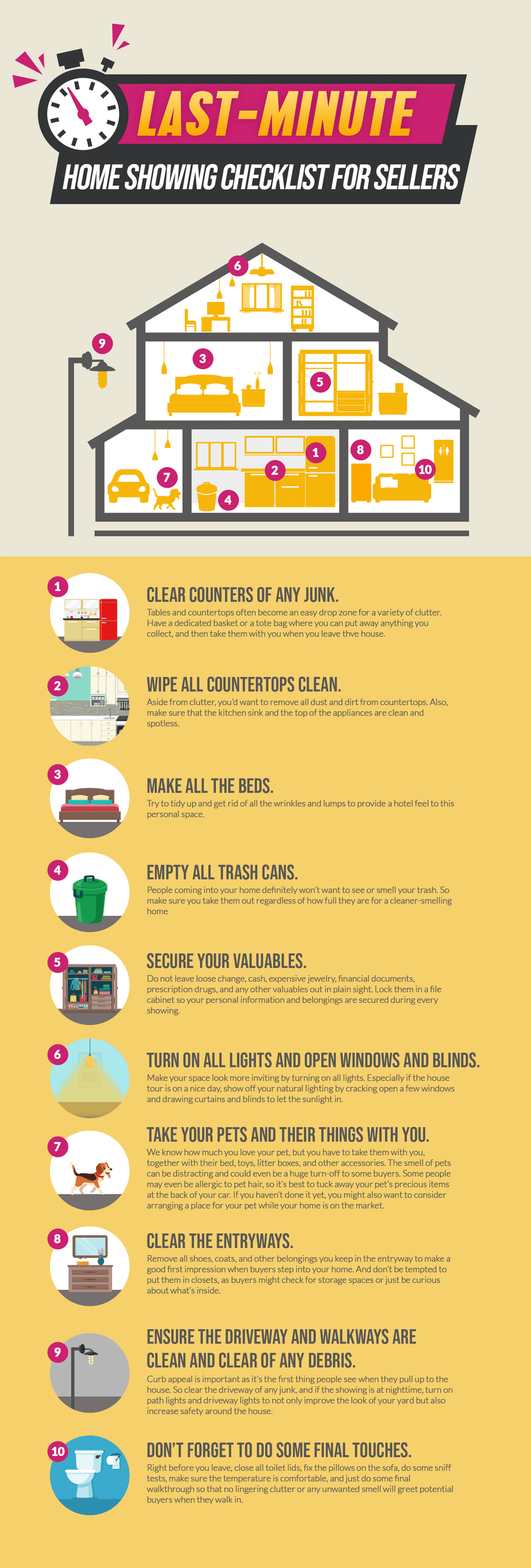 Now, all you need is a simple checklist just in case you get a call from your agent that a buyer wants to see your house in an hour or less. Here are a couple of tasks you can do to further make a good impression and lessen the stress of every single home showing.